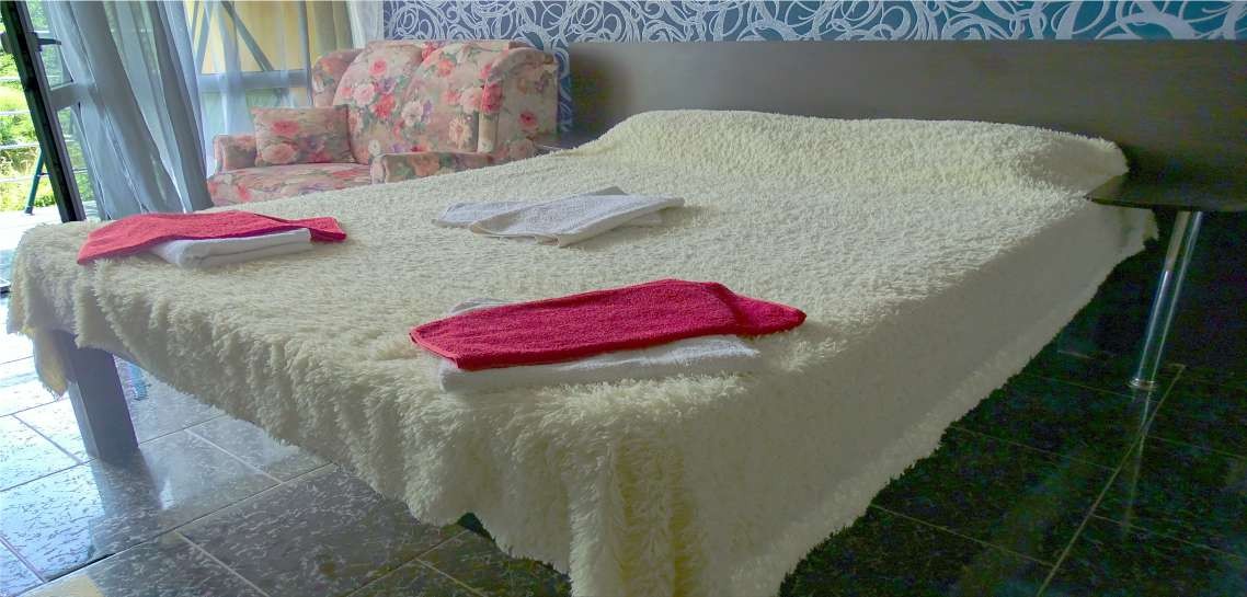 Кровати имеют ортопедический матрац, а также качественный постельный текстиль, для каждого гостя предоставляются полотенца. А также установлен кондиционер, современный телевизор с пакетом ТВ каналов, электронный сейф для ценных вещей, мини холодильник, санузел совмещенный с душевой кабиной (горячая вода из бойлера круглосуточно).